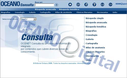 Océano Consulta es un centro de recursos que proporciona acceso vía Internet a contenidos específicos de todas las áreas de conocimiento en español. El producto está dirigido especialmente a los usuarios de las universidades y bibliotecas públicas.