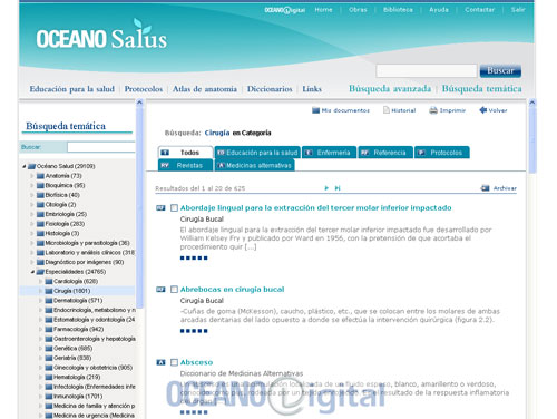 Océano Salus cuenta con un avanzado sistema de búsqueda desarrollado por OcéanoDigital. Permite navegar ágilmente por la base de datos, devolviendo resultados relevantes, desde la búsqueda más amplia a la más restringida.