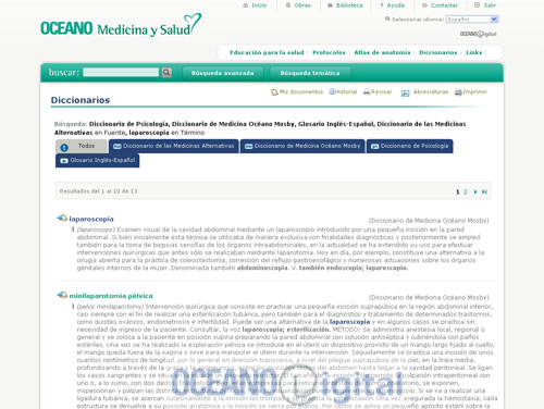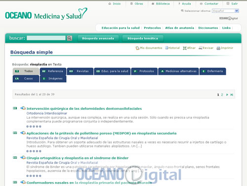 Océano Medicina y Salud has an advanced search tool, developed by Océano, that retrieves from the databases the most relevant results for the widest to the narrowest searches.